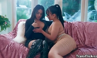 Once Caught On Cheating, a Dark-haired Tranny Has To Please Two Lusty Plump Busty Redheads Wit Her Meatpipe